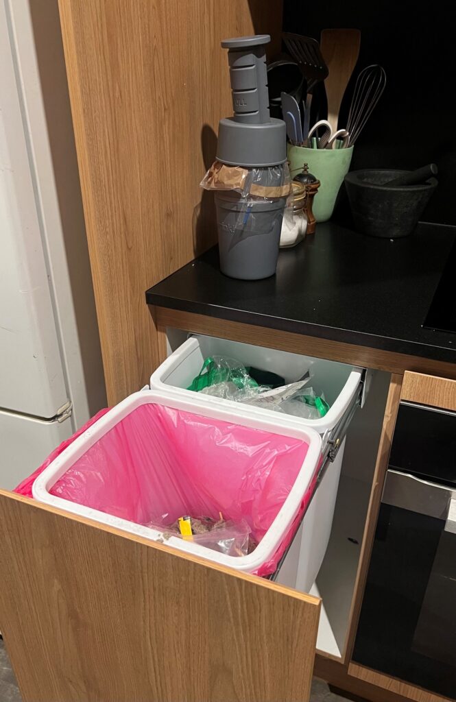 My waste sorting system. You can see the little soft plastic compactor on the bench top.