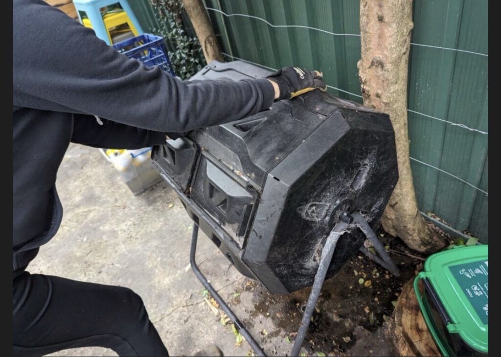 Step 2: Establish a compost bin at home. Do some research to determine which model best suits your household and outdoor environment; for example, our tumbler-style compost bin is easy to turn, and has two separate compartments. Suitable materials include fruit and vegetable scraps, coffee grounds, egg shells, and other food or paper waste. See Val’s compost story for more ideas. Maybe you have a great system too?